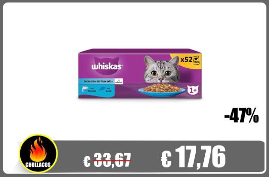 🔥 Whiskas Comida Húmeda para Gatos Adultos Selección Pescados en Gelatina 13x4x85g (TOTAL 52 SOBRES!)