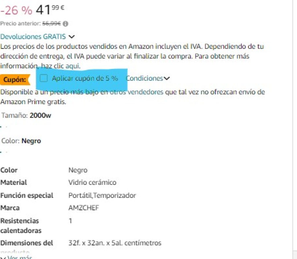 Esta placa de inducción portátil normalmente cuesta unos 56,99 euros, pero gracias a una oferta en Amazon la puedes encontrar a solo 39,89 euros, aplicando el cupón de 5%, lo que te permitirá ahorrar en la compra 17,1 euros y con envio gratis si eres usuario de Amazon Prime o estas en la versión gratuita.