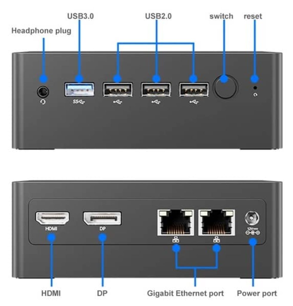 • Interfaz: HDMI2.0 * 1, DP * 1,USB3.0 * 1;USB2.0 * 3, Puerto Gigabit RJ45 * 2, conector combinado para auriculares y micrófono * 1, ranura para tarjeta TF * 1